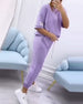 SPECIFICATIONS Style: Casual Top Type: Sweatshirts Category: Sets Material: Cotton Blends Pattern Type: Solid Color Neckline: Round Neck Sleeve Type: Regular sleeve Sleeve Length: Half Sleeve Pants Type: Sweatpant Pants Length: Long Waist Type: Mid Waist Fit Type: Regular Season: Spring,Summer Details: Drawstring Occasion: Daily Package Includ...