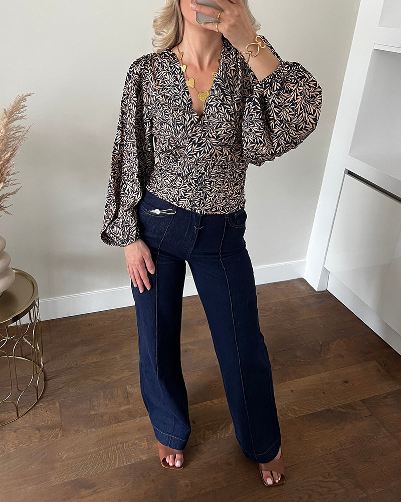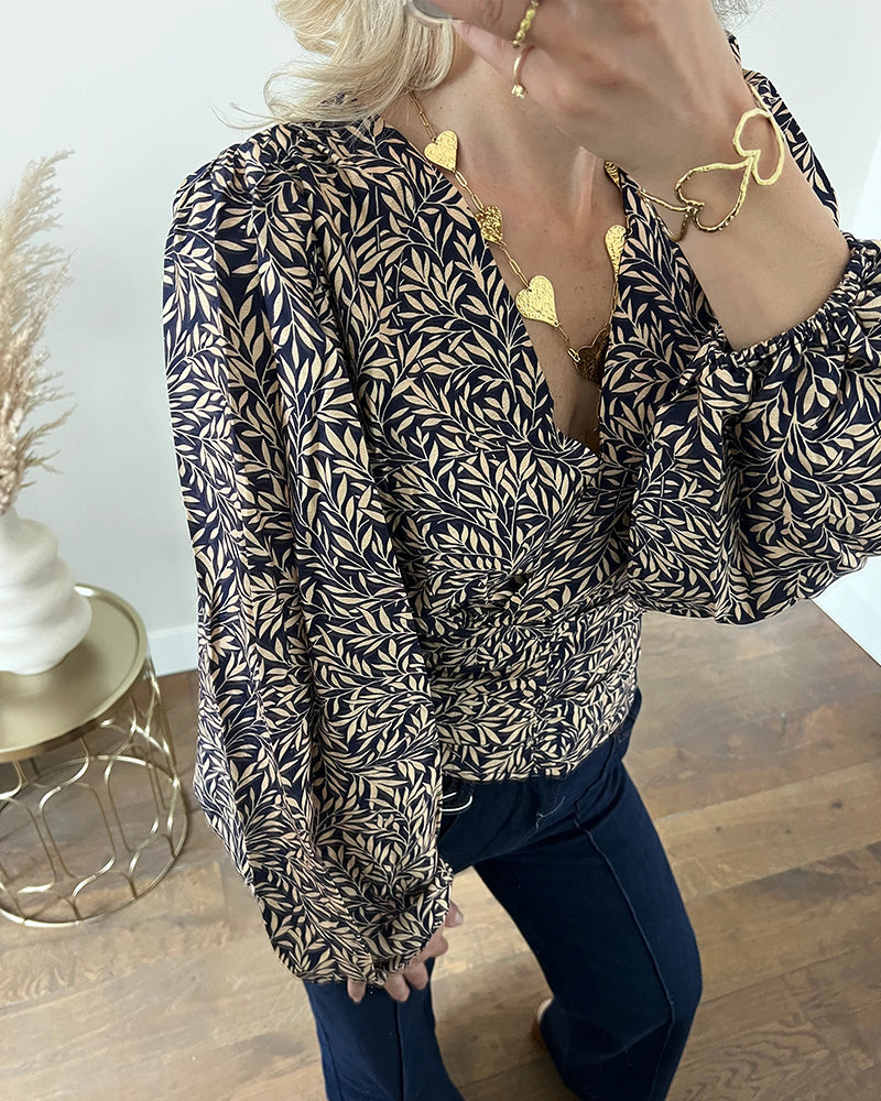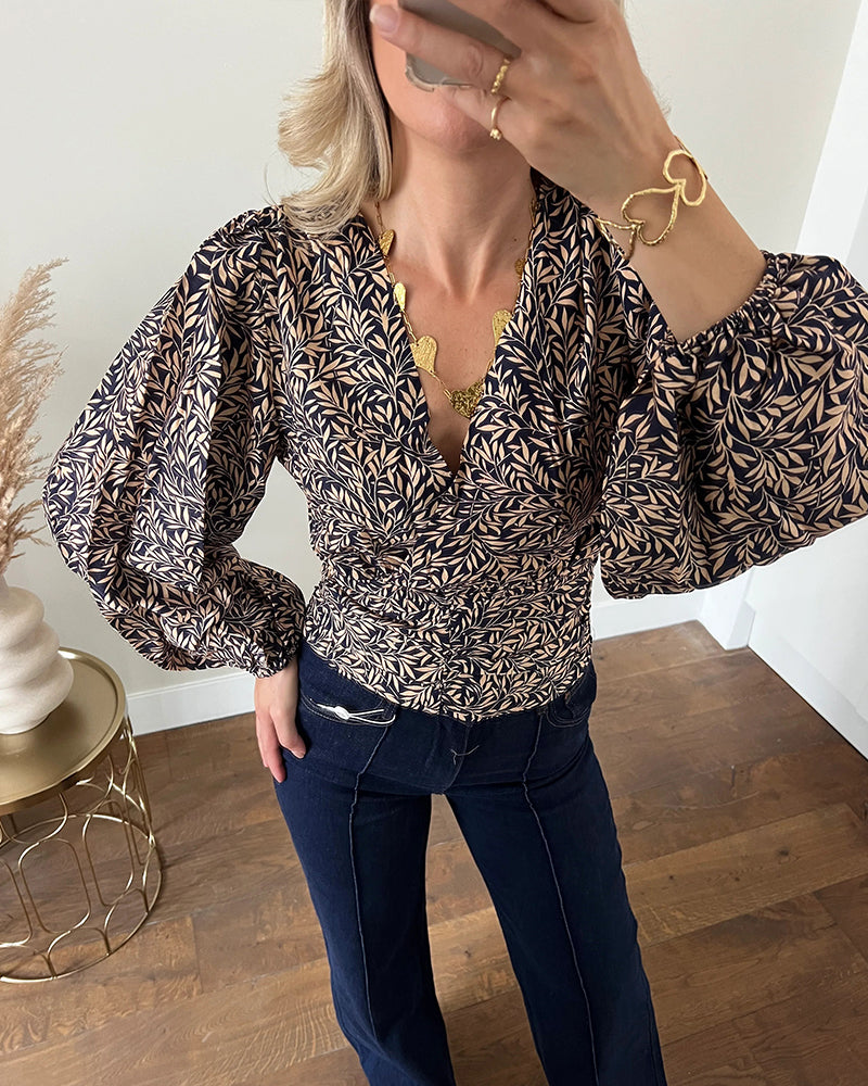 NEW Icon1 Deep V-Neck Puff Sleeve Printed Blouse