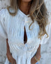 SPECIFICATIONS Top Type: Blouses Style: Casual Material: Cotton Blends Occasion: Daily Neckline: Stand Collar Pattern Type: Solid Color Sleeve Type: Regular sleeve Sleeve Length: Half Sleeve Fit Type: Regular Season: Spring,Summer Details: Shirred Package Includes: 1 x Blouse SIZE TABLE Size Bust Length CM INCH CM INCH S 104 40.94...