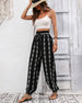 SPECIFICATIONS Style: Casual Material: Cotton Blends Pattern Type: Print Pants Type: Lantern Pants Length: Long Waist Type: High Waist Fit Type: Regular Season: Spring,Summer Details: Lace Up Occasion: Daily Package Includes: 1 x Pants SIZE TABLE Size Waist Hip Length CM INCH CM INCH CM INCH S 65-98 25.59-38.58 118 46.46 107 4...
