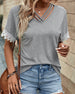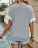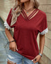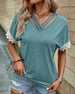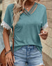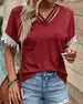SPECIFICATIONS Top Type: Blouses Style: Casual Material: Cotton Blends Occasion: Daily Neckline: V neck_V Pattern Type: Solid Color Sleeve Type: Regular sleeve Sleeve Length: Short Sleeve Fit Type: Regular Season: Spring, Summer, Fall Details: Patchwork, Cut Out, Lace Package Includes: 1 x Blouse SIZE TABLE Size Bust Length S...