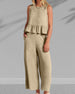 SPECIFICATIONS Top Type: Tops Style: Elegant Material: Cotton Blends Occasion: Daily Neckline: Round Neck Pattern Type: Solid Color Sleeve Length: Sleeveless Pants Length: Long Fit Type: Regular Season: Spring, Summer, Fall Details: Pocket, Ruffle Package Includes: 1 x Top, 1 x Pants SIZE TABLE Size Bust Top length Waist P...