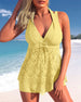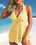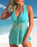 SPECIFICATIONS Style: Vacation Material: 82% Nylon, 18% Spandex Occasion: Vacation Neckline: Halter Pattern Type: Solid Color Sleeve Length: Sleeveless Top Type: Tankini Bra Type: Wireless Bra Bottom Type: Natural Fit Type: Skinny Season: Summer Details: Patchwork, Lace Up, Lace Package Includes: 1 x Tankini SIZE TABLE Size Bust Waist H...