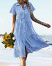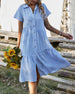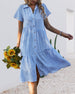 SPECIFICATIONS Style: Casual Material: Cotton Blends Dress Type: Shirt Dress Length: Midi Neckline: Shirt Collar Pattern Type: Print Sleeve Type: Regular sleeve Sleeve Length: Short Sleeve Details: Buckle Fit Type: Regular Season: Spring, Summer Occasion: Daily, Vacation Package Includes: 1 x Dress SIZE TABLE Size Bust Length CM INCH ...