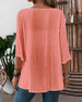 SPECIFICATIONS Top Type: Blouses Style: Casual Material: Cotton Blends Occasion: Daily Neckline: V neck_V Pattern Type: Solid Color Sleeve Type: Regular sleeve Sleeve Length: 3/4 Sleeve Fit Type: Regular Season: Spring, Summer Details: Buttons, Hollow Out Package Includes: 1 x Blouse SIZE TABLE Size Bust Length CM INCH CM INCH ...