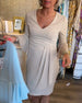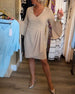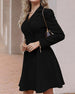 SPECIFICATIONS Style: Elegant Material: Cotton Blends Dress Type: A-Line Dress Length: Knee Length Neckline: V neck_V Pattern Type: Solid Color Sleeve Type: Flare Sleeve Sleeve Length: 3/4 Sleeve Details: Patchwork, Shirred Fit Type: Regular Season: Spring, Summer, Fall Occasion: Daily Package Includes: 1 x Dress SIZE TABLE Size...