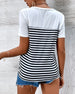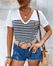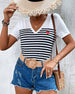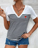 SPECIFICATIONS Top Type: T-shirt Style: Casual Material: Cotton Blends Occasion: Daily Neckline: V neck_V Pattern Type: Striped,Print Sleeve Type: Regular sleeve Sleeve Length: Short Sleeve Fit Type: Regular Season: Spring,Summer Package Includes: 1 x T-shirt SIZE TABLE Size Bust Length CM INCH CM INCH S 97 38.19 65 25.59 M 10...