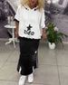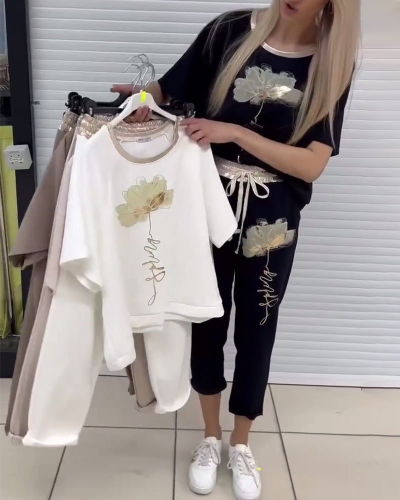SPECIFICATIONS Style: Casual Top Type: T-shirt Category: Sets Material: Cotton Blends Pattern Type: Print Neckline: Round Neck Sleeve Type: Regular sleeve Sleeve Length: Short Sleeve Pants Type: Sweatpant Pants Length: 3/4 Long Waist Type: Mid Waist Fit Type: Regular Season: Spring,Summer Details: Pocket,Lace Up,Drawstring Occasion: Daily Pack...