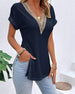 SPECIFICATIONS Top Type: T-shirt Style: Casual Material: Cotton Blends Occasion: Daily Neckline: V neck_V Pattern Type: Print Sleeve Type: Regular sleeve Sleeve Length: Short Sleeve Fit Type: Regular Season: Spring,Summer Details: Patchwork,Lace Package Includes: 1 x T-shirt SIZE TABLE Size Bust Length CM INCH CM INCH S 97 38.19...