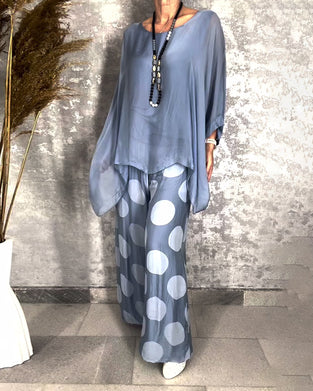 SPECIFICATIONS Style: Casual Top Type: Blouses Category: Sets Material: Cotton Blends Pattern Type: Polka Dot,Print Neckline: Round Neck Sleeve Type: Bat sleeve Sleeve Length: Nine Points Sleeve Pants Type: Wide Leg Pants Length: Long Waist Type: Mid Waist Fit Type: Regular Season: Spring,Summer Occasion: Daily Package Includes: 1 x Blouse, 1 ...