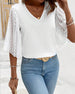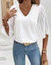 SPECIFICATIONS Top Type: Blouses Style: Casual Material: Cotton Blends Occasion: Daily Neckline: V neck_V Pattern Type: Solid Color Sleeve Type: Flare Sleeve Sleeve Length: 3/4 Sleeve Fit Type: Regular Season: Spring,Summer Details: See-through Package Includes: 1 x Blouse SIZE TABLE Size Bust Length CM INCH CM INCH S 97 38.19 6...