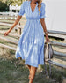 SPECIFICATIONS Style: Casual Material: Cotton Blends Dress Type: A-Line Dress Length: Midi Neckline: V neck_V Pattern Type: Striped, Print Sleeve Type: Puff Sleeve Sleeve Length: Short Sleeve Details: Buttons Fit Type: Regular Season: Spring, Summer, Fall Occasion: Daily Package Includes: 1 x Dress SIZE TABLE Size Bust Length ...
