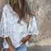 SPECIFICATIONS Top Type: Blouses Style: Casual Material: Cotton Blends, Lace Occasion: Daily Neckline: V neck_V Pattern Type: Solid Color Sleeve Type: Puff Sleeve Sleeve Length: 3/4 Sleeve Fit Type: Regular Season: Spring, Summer, Fall Details: Patchwork, Hollow Out Package Includes: 1 x Blouse SIZE TABLE Size Bust Length Sle...